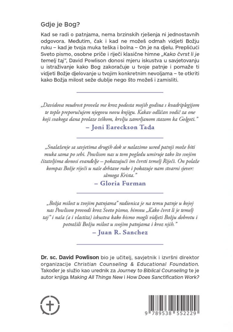 Preplićući Sveto pismo, osobne priče i riječi klasične himne „Kako čvrst li je temelj taj”, David Powlison donosi mjeru iskustva u savjetovanju u istraživanje kako Bog zakoračuje u patnje čovjeka i pomaže mu vidjeti Božje djelovanje u konkretnim nevoljama – te otkriti kako Božja milost seže dublje nego što možemo i zamisliti. Format: Meki uvez Dimenzije: 125 x 200 x 8 mm Broj stranica: 120