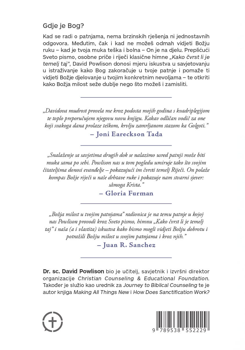 David Powlison, s mudrošću dugogodišnjeg biblijskog savjetnika, ne nudi floskule. Umjesto toga, on nas nježno uzima za ruku i vodi kroz stihove bezvremenske himne „Kako čvrst je temelj taj“, pokazujući nam kako se Božja obećanja isprepliću s našim najtežim danima.